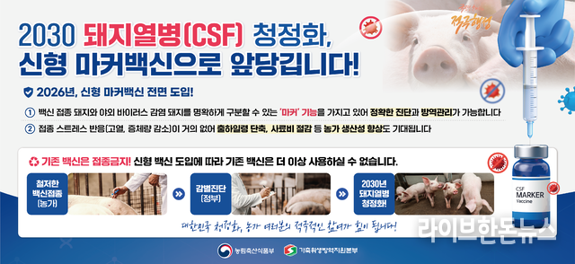 경남도가 돼지열병(CSF) 청정화와 국제 기준에 부합하는 방역체계 구축을 위해 2026년부터 기존 생독백신을 전면 중단하고 마커백신으로 전환한다. 이에 따라 도내 모든 양돈농가는 마커백신 접종을 의무적으로 이행해야 한다.